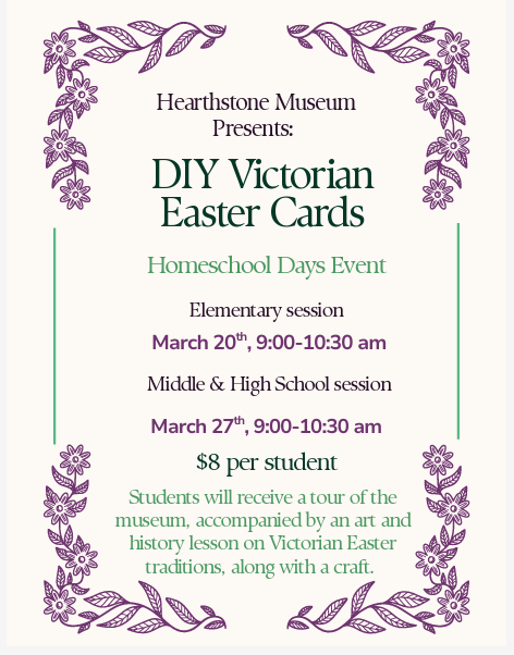 Join us for a tour of Hearthstone and a lesson in Victorina art and history while making your own Victorian-style Easter cards.